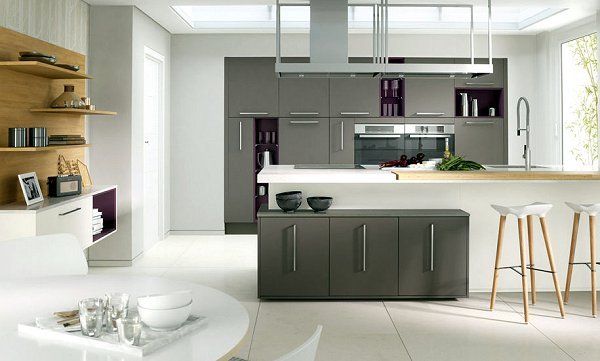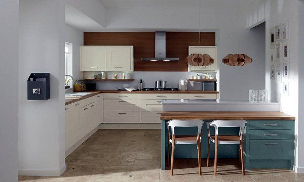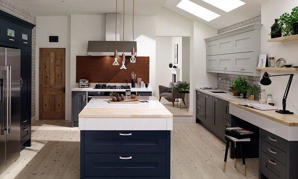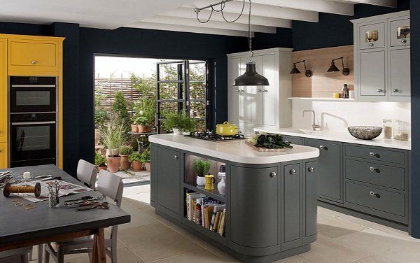 The simple form of the in-frame slab door allows for flowing and elaborate layouts even on a relatively modest footprint. Blending different levels, colours & shapes makes for an inviting look that would work in any setting. Colours featured are Slate, Saffron, Partridge Grey and Cornflower Blue.