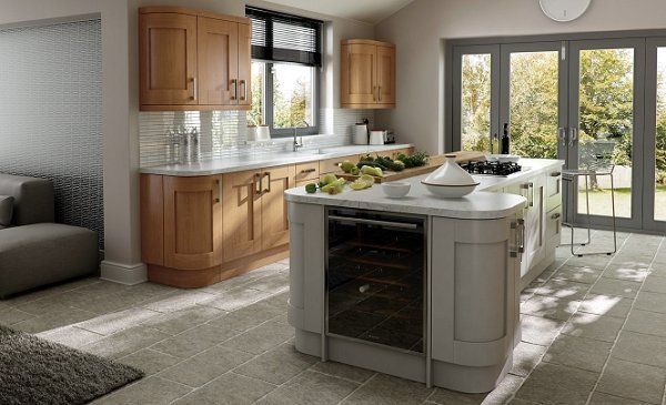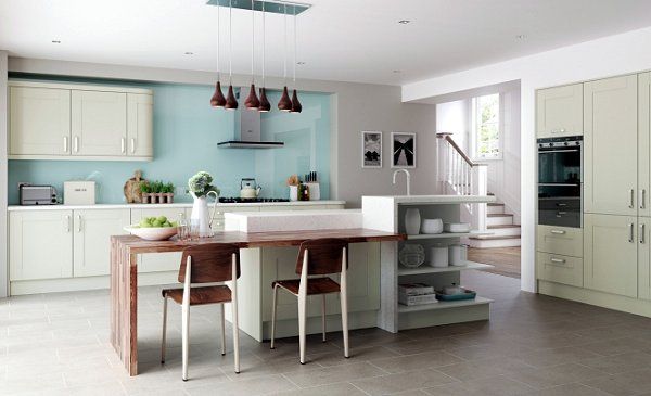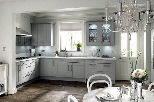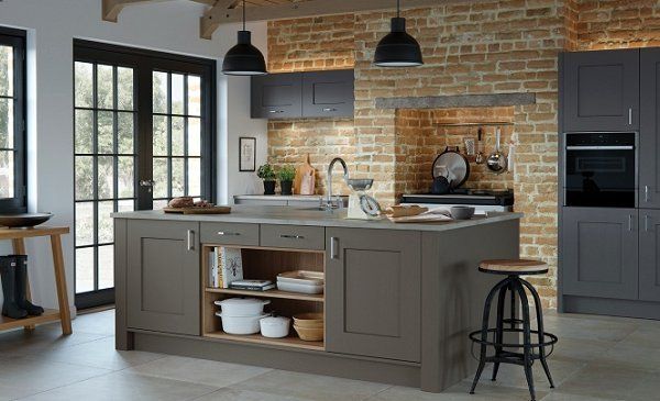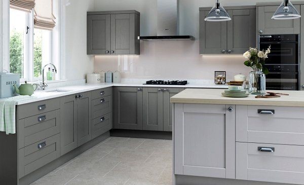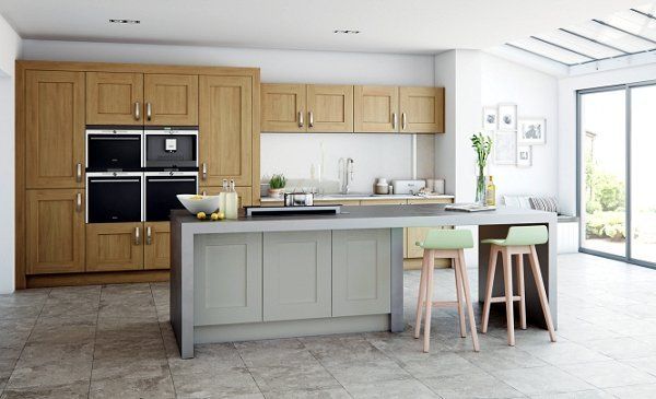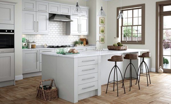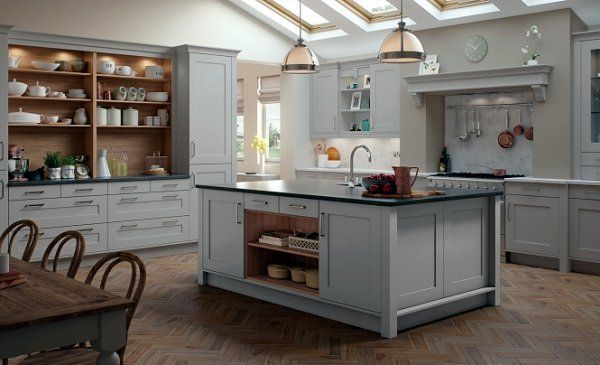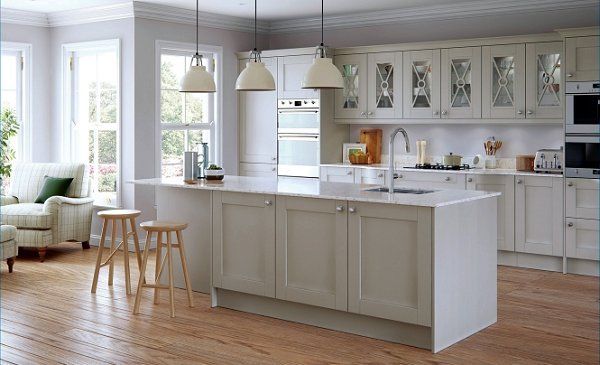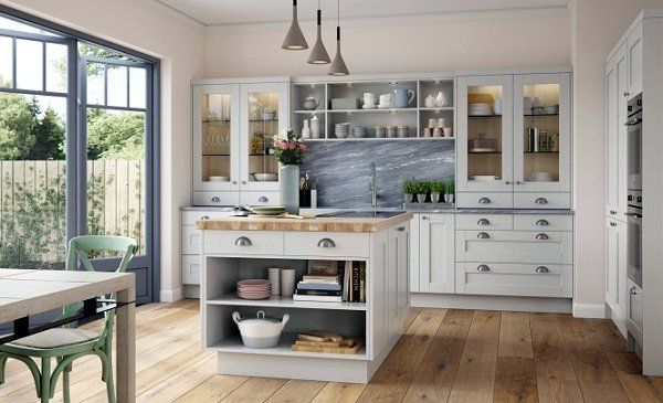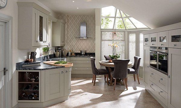 Our popular Broadoak Shaker range is shown here in the stylish Partridge Grey. It's unfussy style is complimented by the Bianco Rivers worksurface with waterfall edges. This very neutral scheme creates a timeless yet elegant style that will never look old, the stainless steel handles add a more modern feel along with the wallpaper inside the wall unit.